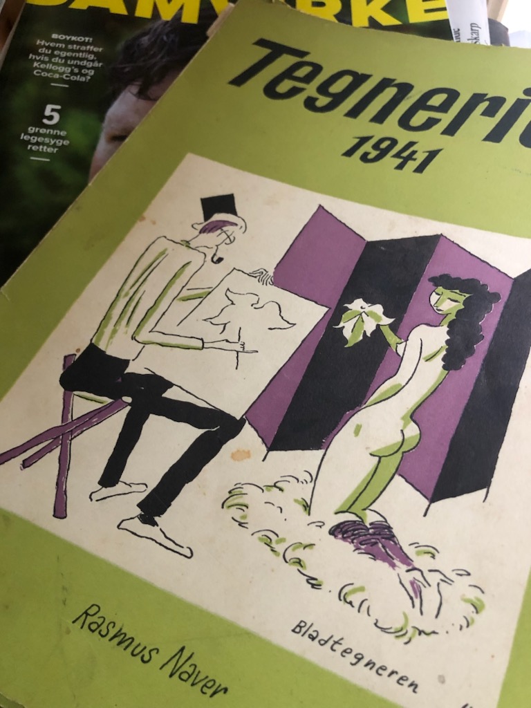 Ved endnu et kig ind i genbrugsstationens bogcontainer blev mit blik fanget af et hæfte med danske bladtegneres Tegnerier i 1941, altså mens Danmark var besat og medierne censureret. Arne Ungermanns forsidetegning illustrerer ganske godt bladets pointer: En nøgen model sidder med et blad i hånden. Bladtegneren er i helt bogstavelig forstand bladtegner, og beskueren af hans billede må tænke sig til den nøgne kvinde, der har holdt bladet; akkurat som man ved de øvrige billeder i hæftet må tænke sig til den kontekst, de er skabt i.